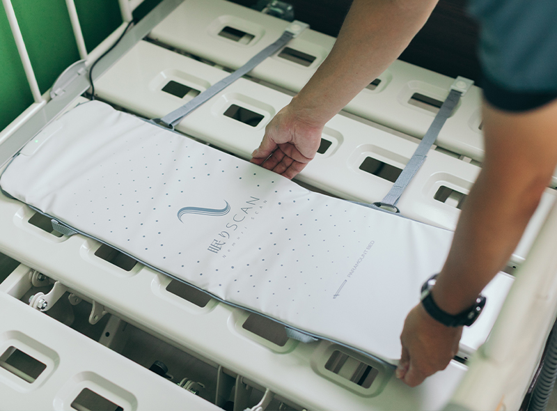 ICTやオンラインツールを活用し、施設内だけではなく、クリニックや訪問看護事業所とも入居者様の情報を適宜共有、最適な医療と介護が途切れることなくつながる体制を整えています。全ベッドに装置された眠りスキャンにより、お休みの間もご本人のバイタルが常時把握され、必要時以外のむやみな見守りをしないことで安眠を妨げないようにしております。